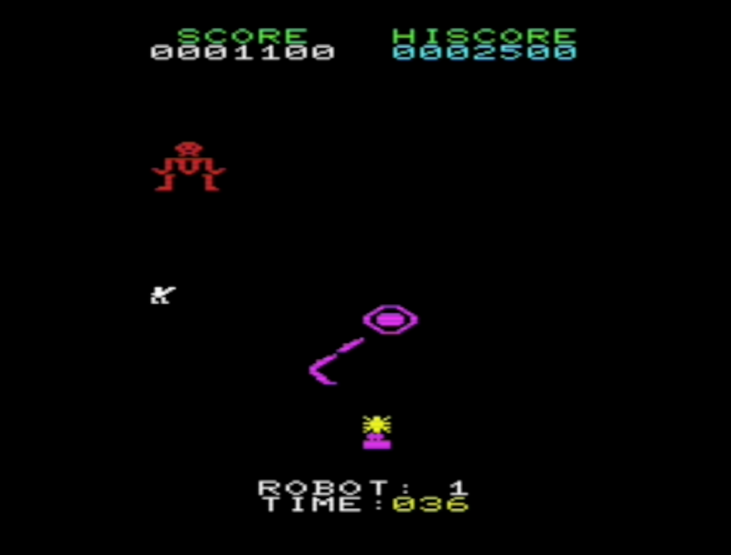 The player's score is displayed at the top of the screen. The player moves down the screen in one of eight positions. At the bottom of the screen, the player picks up a gear, which they try to bring back to the top of the screen. Once a gear arrives at the top of the screen, 1/6th of a robot will appear. Point values are quite a bit higher than the value used in the electro-mechanical version of the game. Building an arm or leg scores 100 points, the torso 200 points, and completing the robot by adding the head scores 500 points before allowing the player to progress to the next level.